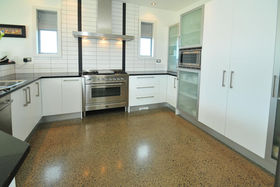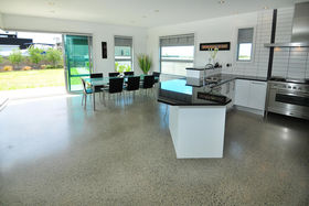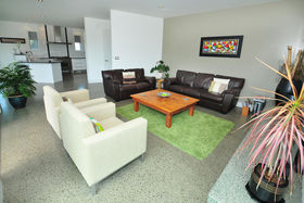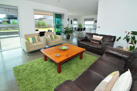 Architecturally designed by Alistair Watts this large 308 sum beach house or permanent home sits on a generous 853 sum level site and faces due north for all day sun. The dwelling comprises of 4 double bedrooms, 2 bathrooms, large open plan dining/kitchen/living area opening onto a sunny courtyard and two separate lounge areas. Downstairs a minimum 2.7m stud height and vaulted entry ceilings gives a real feeling of spaciousness. Easy care polished concrete floors on the lower level (including the double garage) are a real feature and a large separate laundry completes the downstairs area.